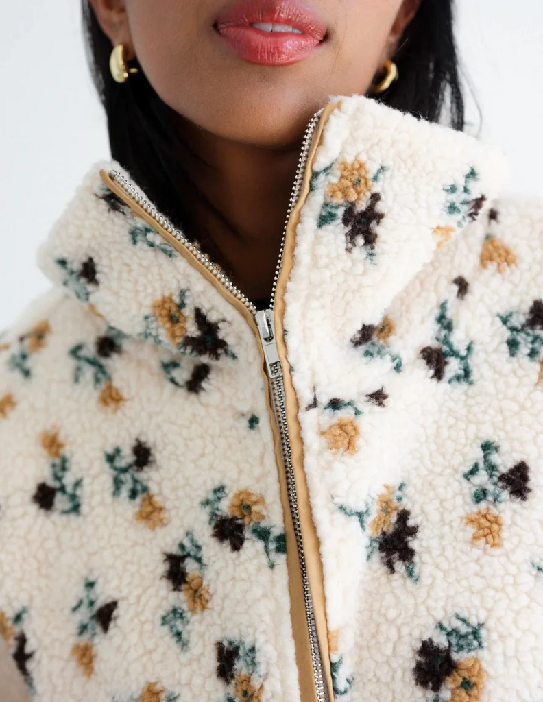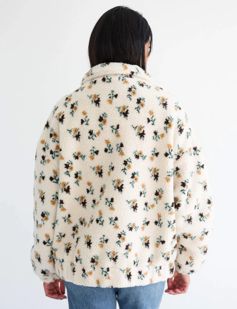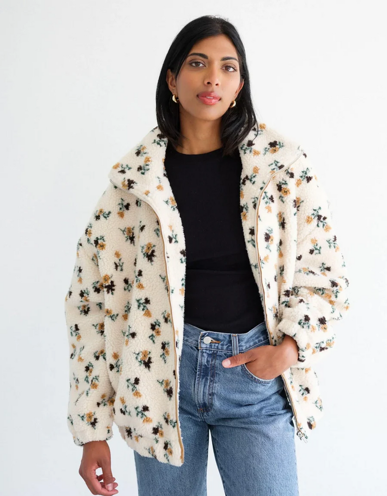 Our newest Sherpa has a relaxed body with an all-over floral print, a full zip and the coziest collar. Let's make it Sherpa season forever.
