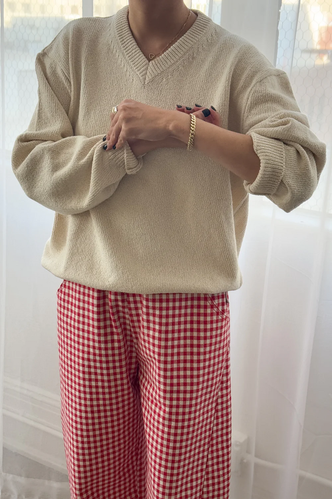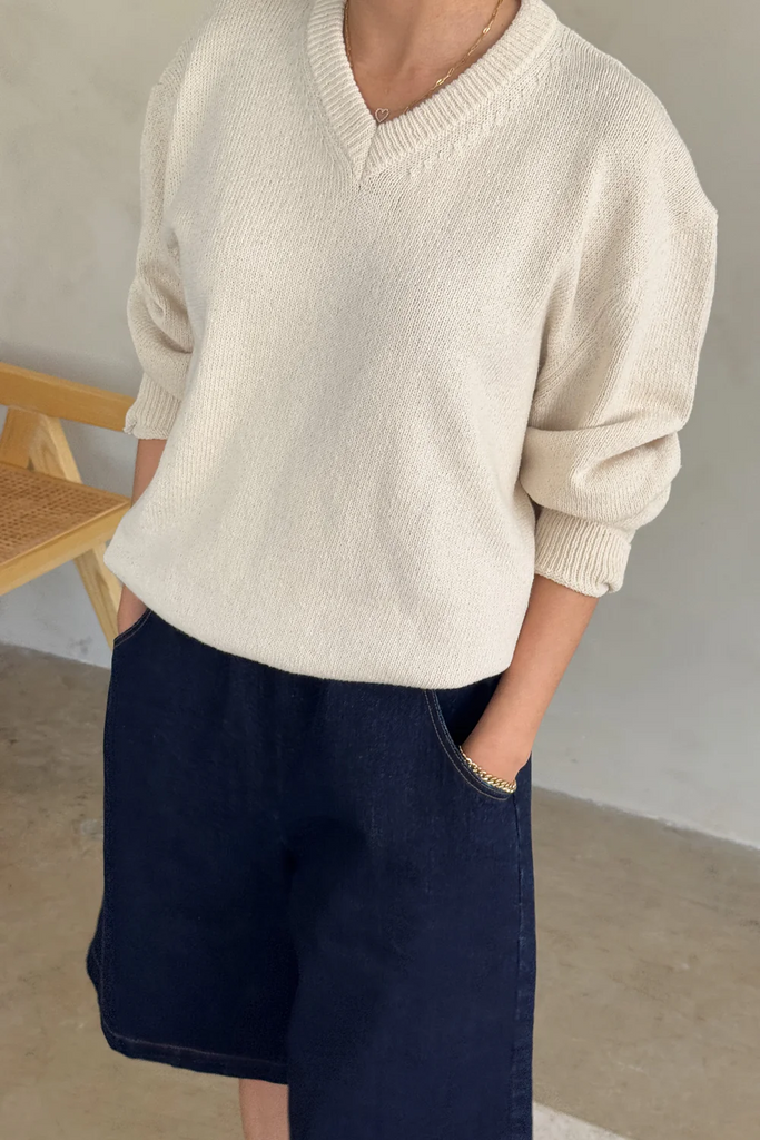 Designed to fit like your dad’s vintage sweater, the Gabby V-Neck Sweater fills that nostalgic gap in your wardrobe. With a slightly oversized fit and ribbed details along the neckline, cuffs, and hem, it's lightweight, breathable, and perfect for layering over a tee or wearing on its own. A timeless piece that transcends seasons.