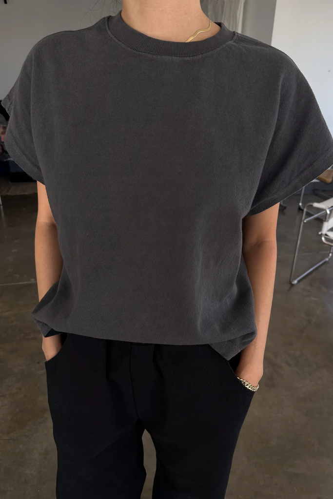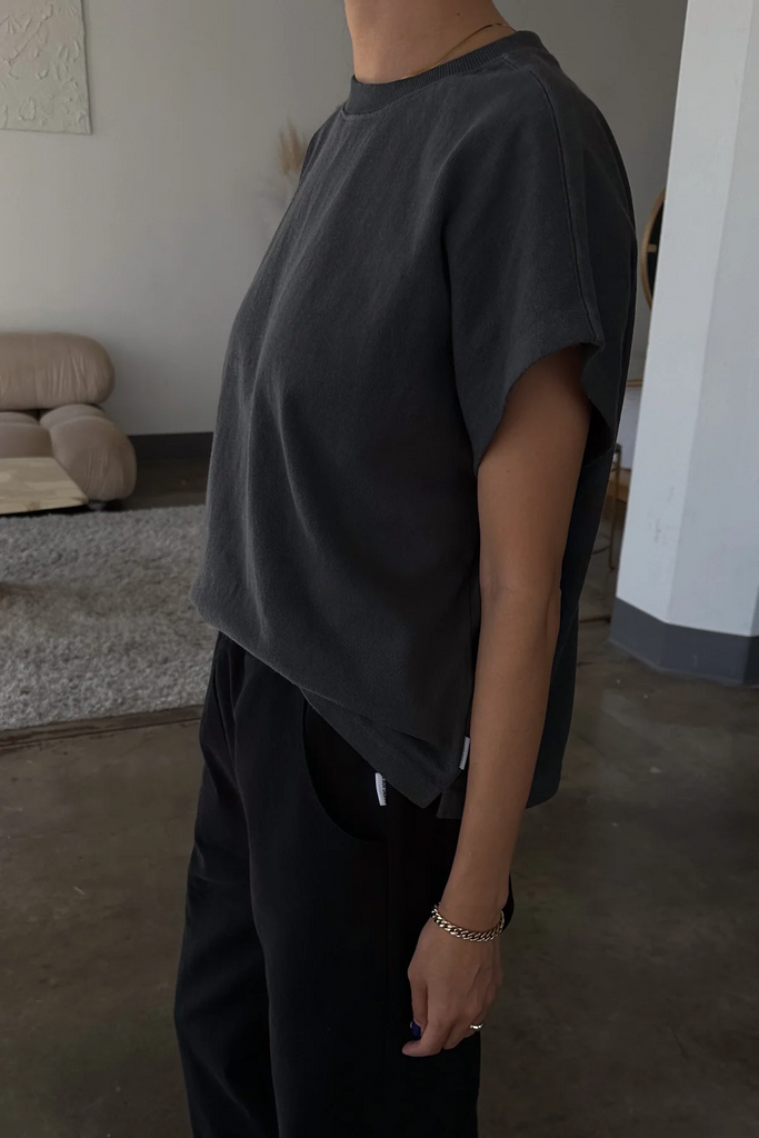 Jeanne Tee is our perfect muscle tee. She features a shorter length to pair perfectly with high waisted bottoms but still give enough coverage for mid-rise bottoms and just the right amount of off shoulder dolman sleeve. She has a high crew neck with an extra wide neckband that adds to her signature charm.