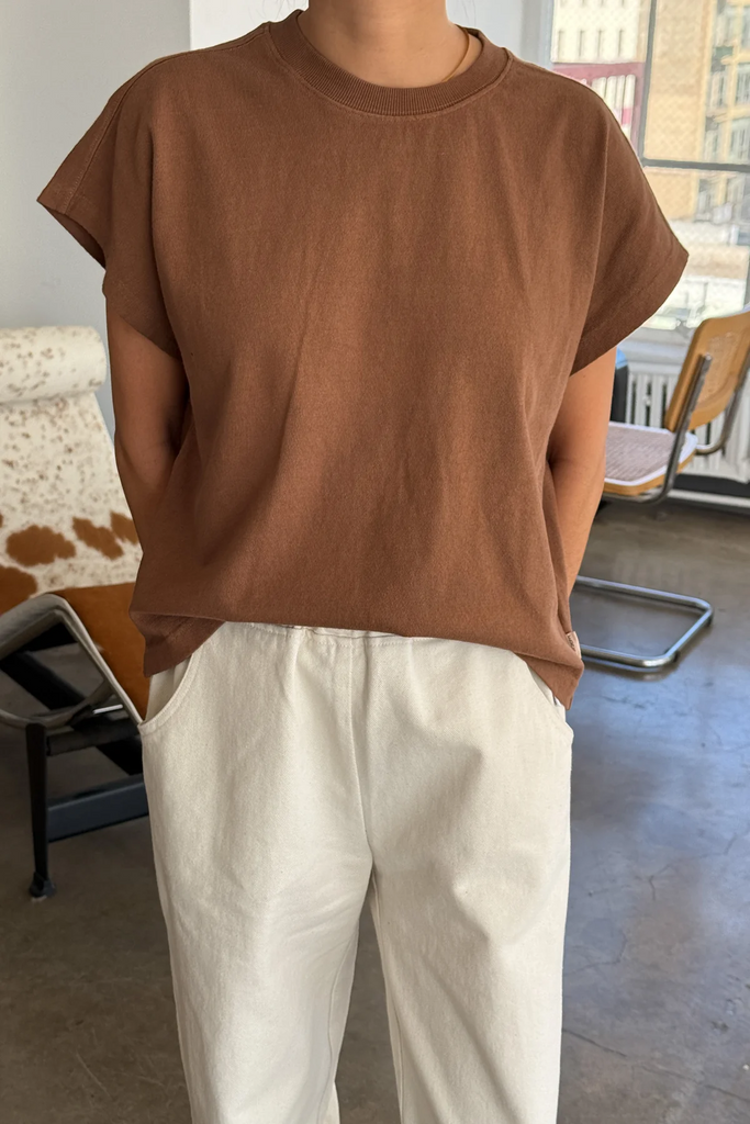 Jeanne Tee is our perfect muscle tee. She features a shorter length to pair perfectly with high waisted bottoms but still give enough coverage for mid-rise bottoms and just the right amount of off shoulder dolman sleeve. She has a high crew neck with an extra wide neckband that adds to her signature charm.