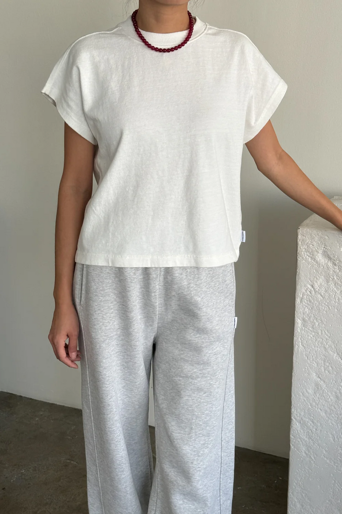 Jeanne Tee is our perfect muscle tee. She features a shorter length to pair perfectly with high waisted bottoms but still give enough coverage for mid-rise bottoms and just the right amount of off shoulder dolman sleeve. She has a high crew neck with an extra wide neckband that adds to her signature charm.