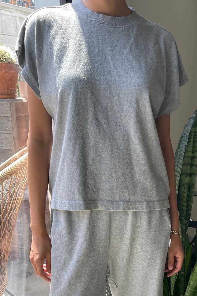 Jeanne Tee is our perfect muscle tee. She features a shorter length to pair perfectly with high waisted bottoms but still give enough coverage for mid-rise bottoms and just the right amount of off shoulder dolman sleeve. She has a high crew neck with an extra wide neckband that adds to her signature charm.