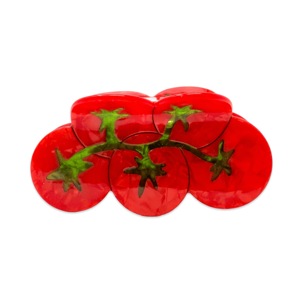 Bring some garden-fresh style to your look with our Large Tomatoes on the Vine Hair Claw Clip! Measuring approximately 4" x 2" x 1.5", this playful food-themed hair accessory is handmade and hand-painted from eco-friendly cellulose acetate. Just like real tomatoes, each clip has its own unique color variations. A fun and sustainable choice for tomato girls, veggie lovers, and anyone craving a bold hair statement.