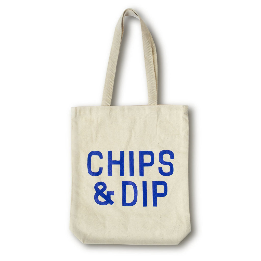 Natural canvas tote bag with extra-long handles to better fit over your shoulder, and and our bold new Chips & Dip graphic in electric blue.