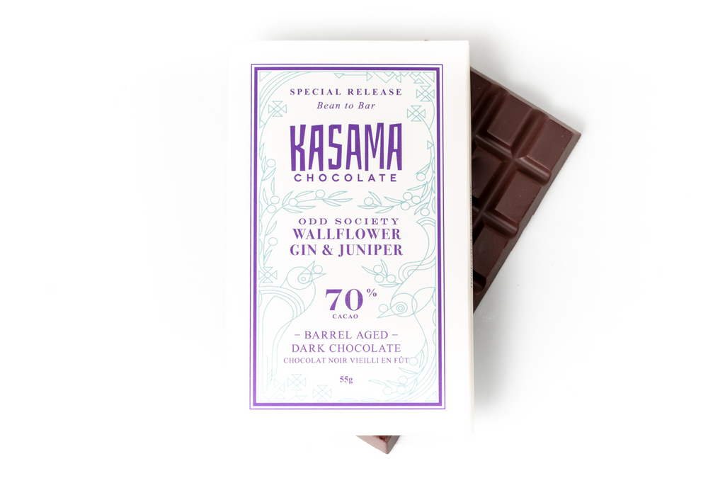 For this special batch of chocolate, we aged our Ugandan cacao beans in an oak cask for 4 weeks with Odd Society Distillery’s Wallflower Gin, then stone ground them with juniper berries.