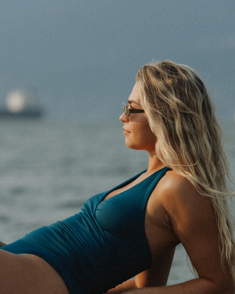 Hit the sand in our newest women’s one-piece, with a classic halter back, plunging v-neckline, and leg-lengthening cut. Featuring flattering ruching at the waist, the Parker delivers resort-ready vibes with high-quality luxury.