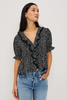 Lightly-textured poplin shapes the Bloom, a loose, relaxed-fit shirt with a cascading ruffled deep V-neckline, front buttons, puff sleeves with smocked cuffs, pintuck detailing, and crochet trim.