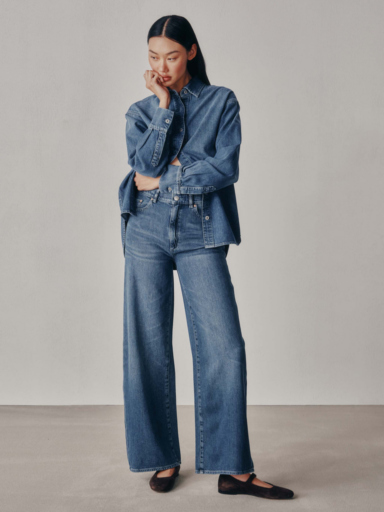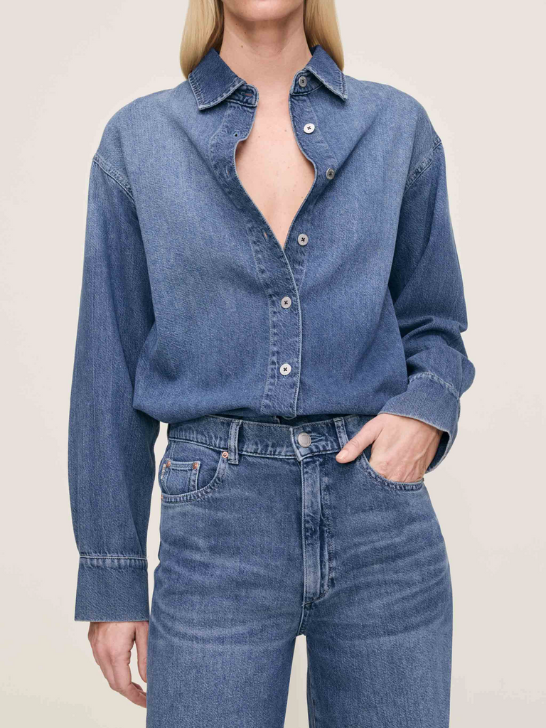 Faye is a relaxed-fit button down shirt with a pointed collar, high-low rounded shirt tail hem and a patch pocket at the chest.