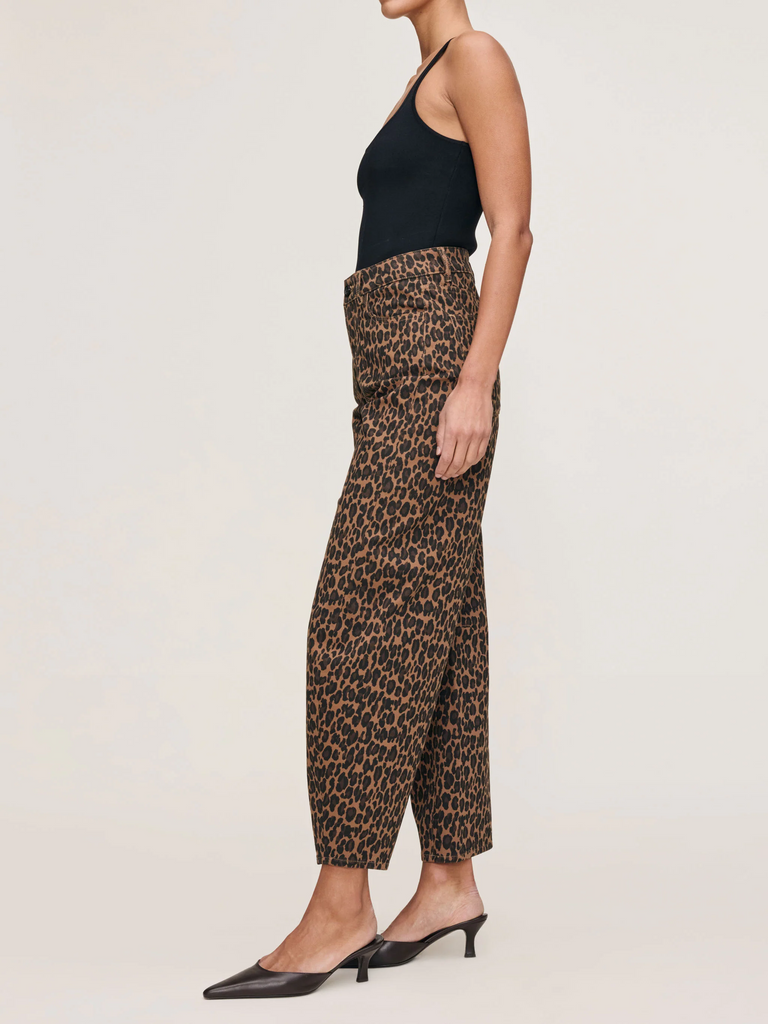 Miro is a high-rise, true barrel leg jean that is fitted at the hip and hits at ankle length, tapering at the leg.