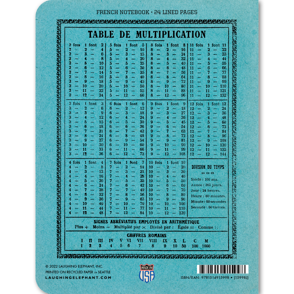 24 pages, squared This is a dessin quadrillé, or grid drawing, notebook with exceptional design! It's unique among our journal notebooks, featuring gridded pages instead of the standard lines, ready to record your drawings or designs. The back cover features vintage-style information, such as multiplication and measurement tables. This product was custom designed and created at our location in Seattle.