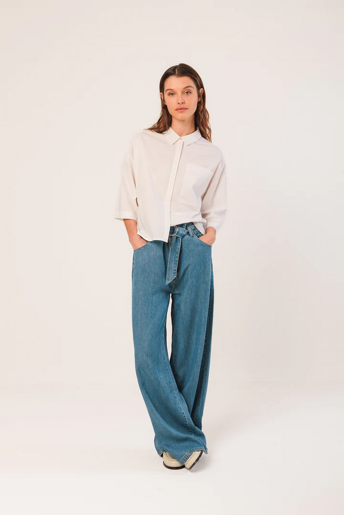 A classic white shirt but in a crop version. A revamped garment with a square cut, dropped shoulders and loose-fitting short sleeves. The cotton poplin gives the shirt a trendy aspect.