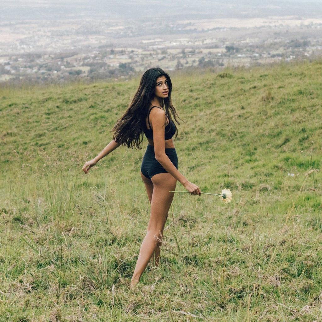Model Meeya pictured in the black set is wearing a size Small and is 5'6" tall with a 32" chest, 22" waist and 33" hips.