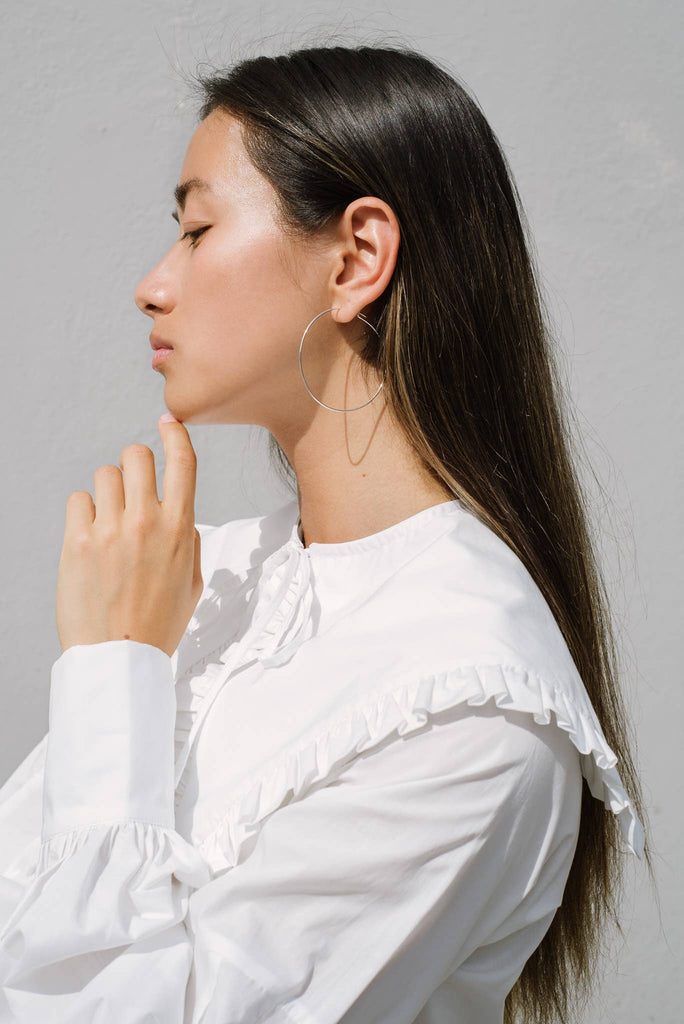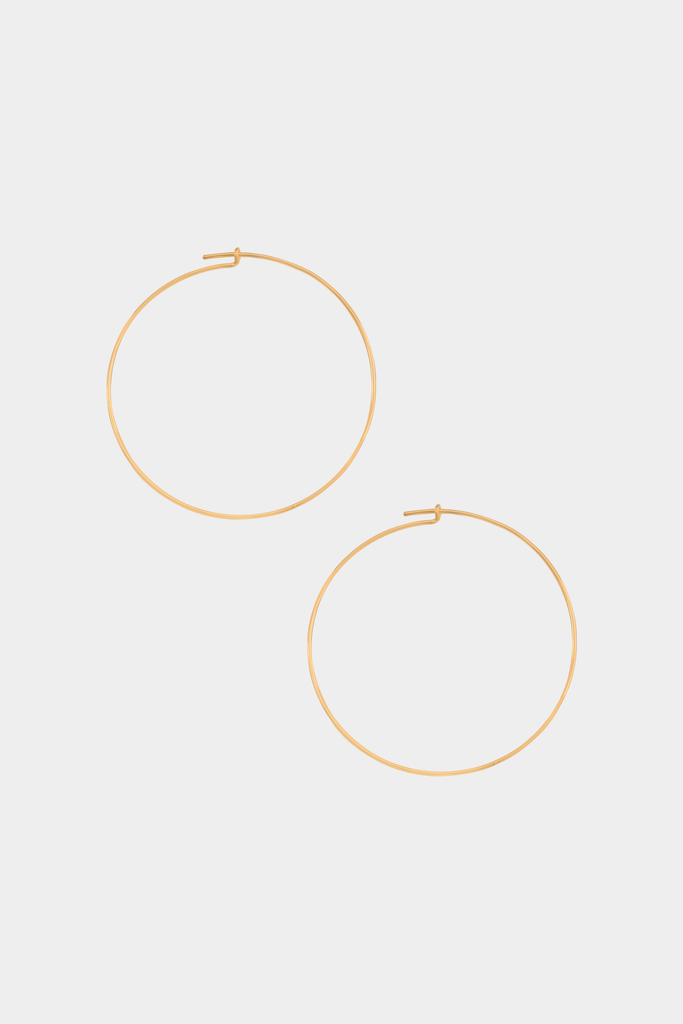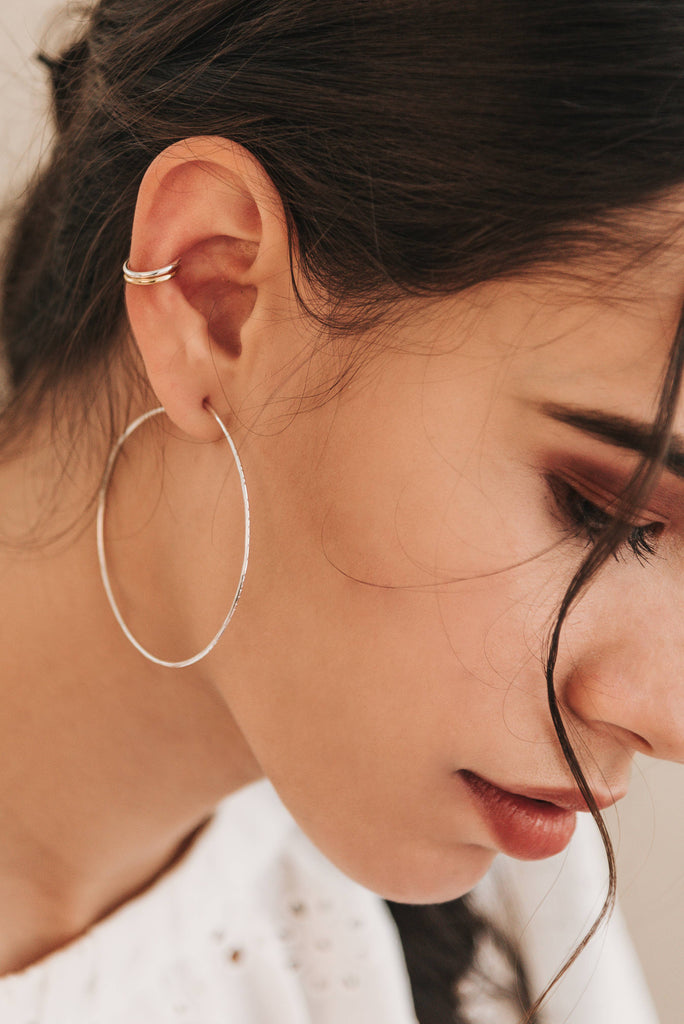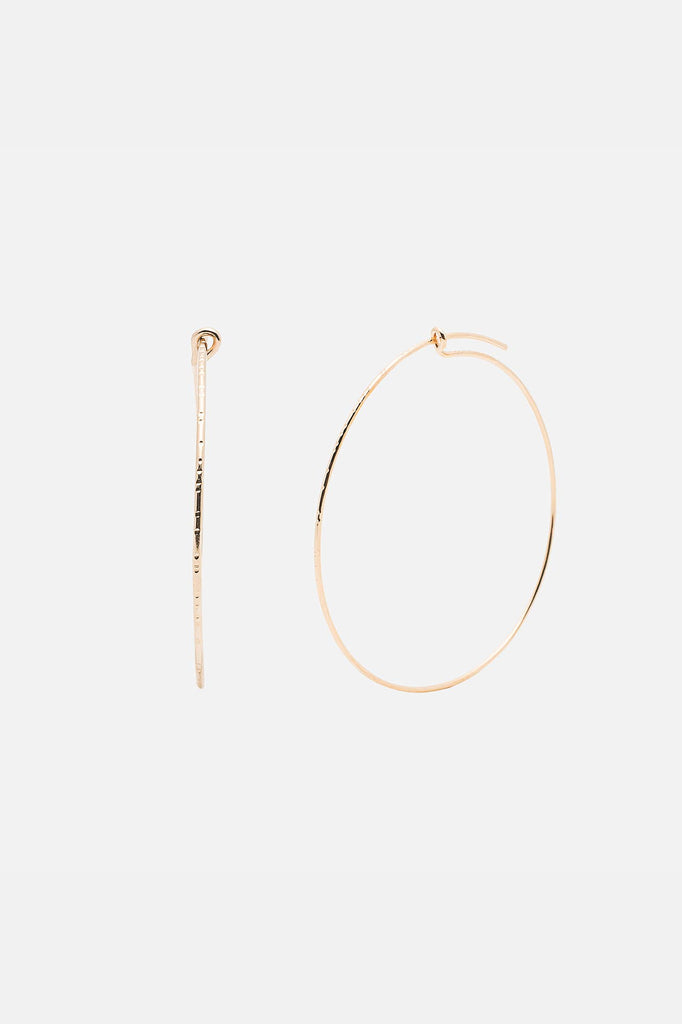 Circular-shaped, fully closed pull-through hoops with delicate tapped detail. Super lightweight and easy to wear. - Dimensions: Outer diameter -- 55mm (2.25in). - Materials: Argentium sterling silver or yellow gold fill 14K