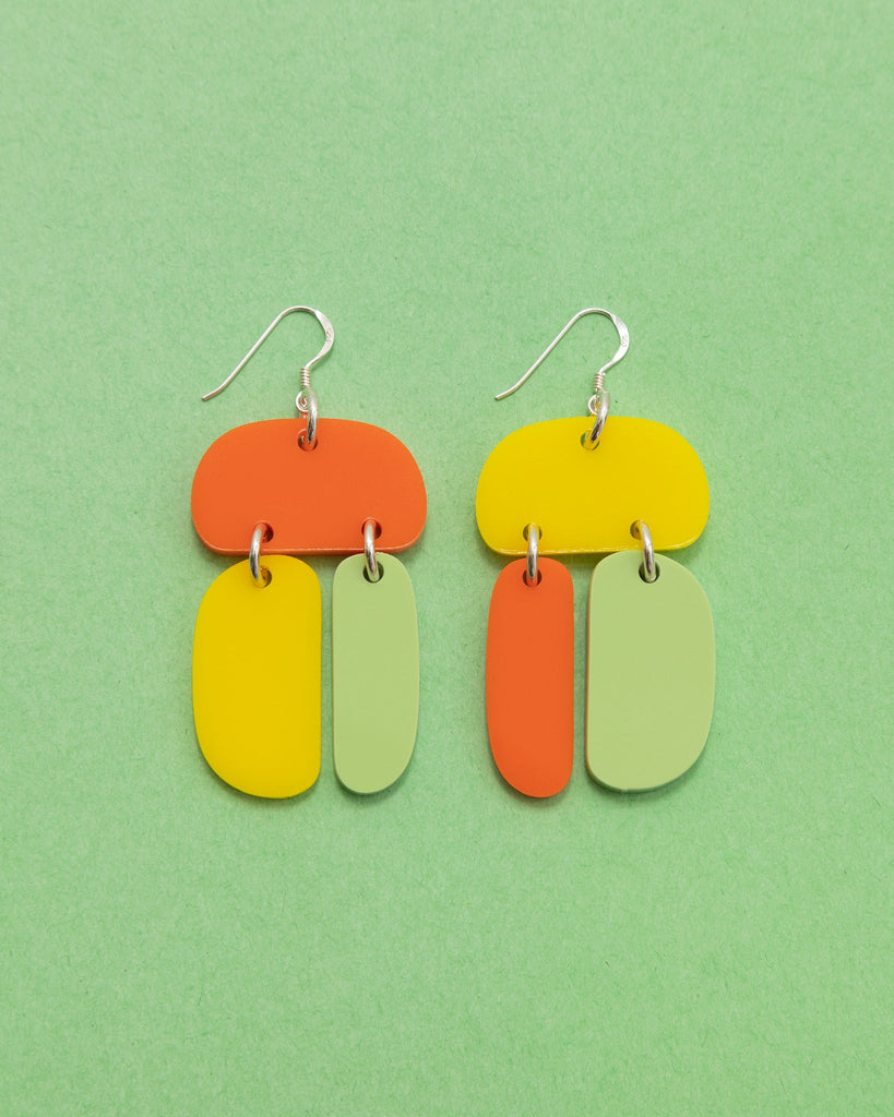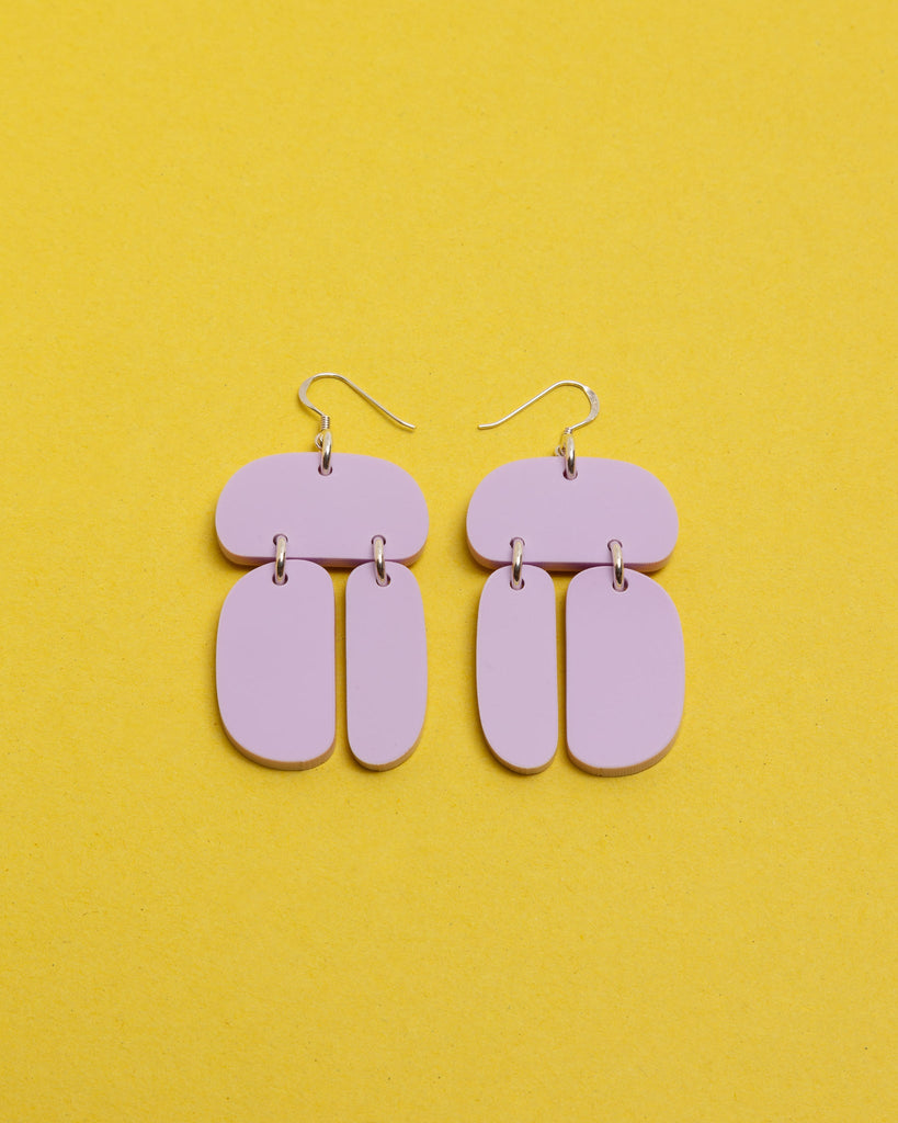 A group of 3 ovoids, earrings in acrylic and sterling silver. You might also see, deer footprints.