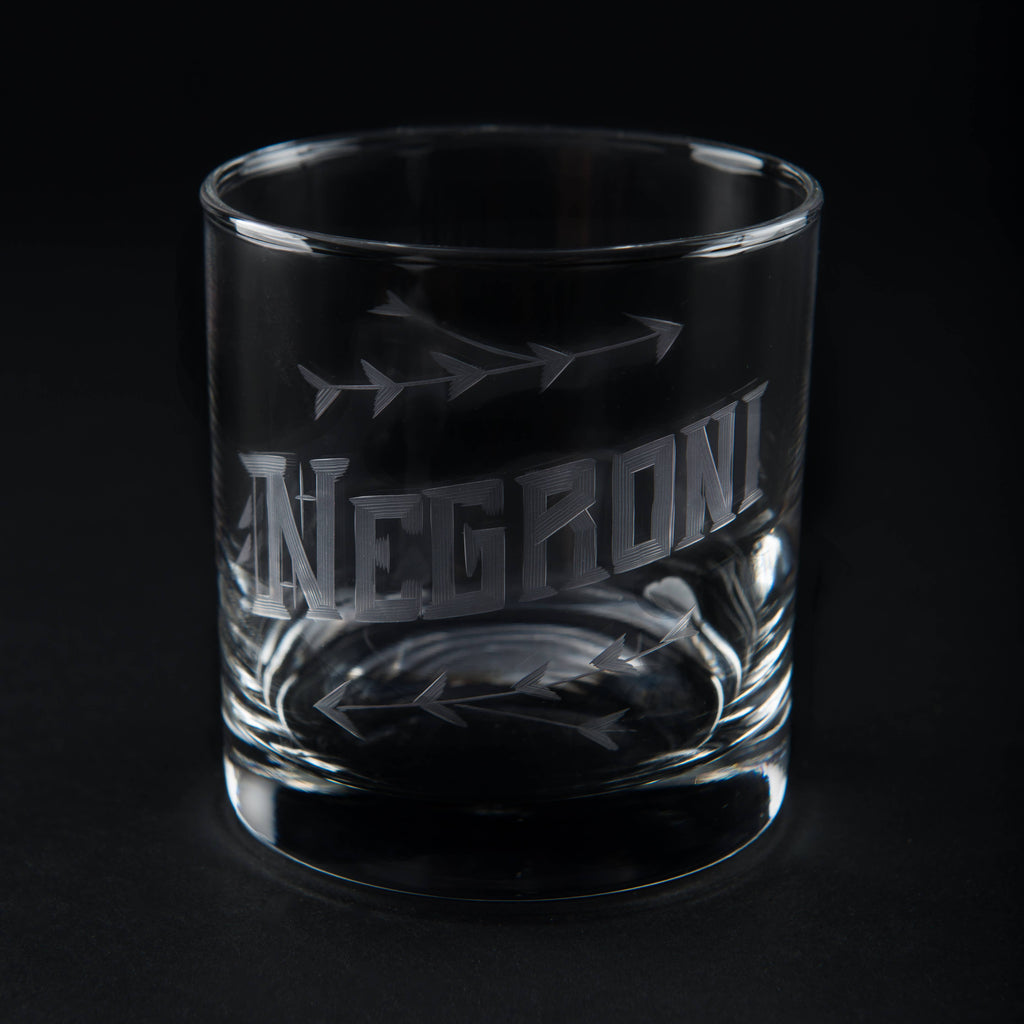 Hand engraved 10 oz. rocks glass. Dishwasher safe.