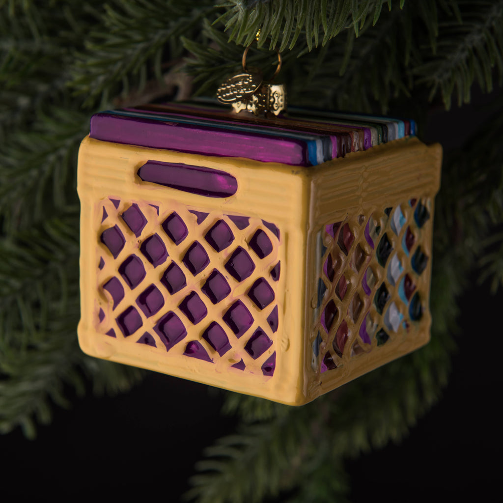 Looking for the perfect gift for the vinyl aficionados in your life? This throw-back hand-blown glass record crate looks just like the real thing with it's hand-painted vinyl records and yellow milk crate. Comes packaged in a custom-made box printed with a retro holiday design that’s just too good to hide with wrapping paper. Perfect for gifting to yourself or others. 3" x 2.5" glass ornament