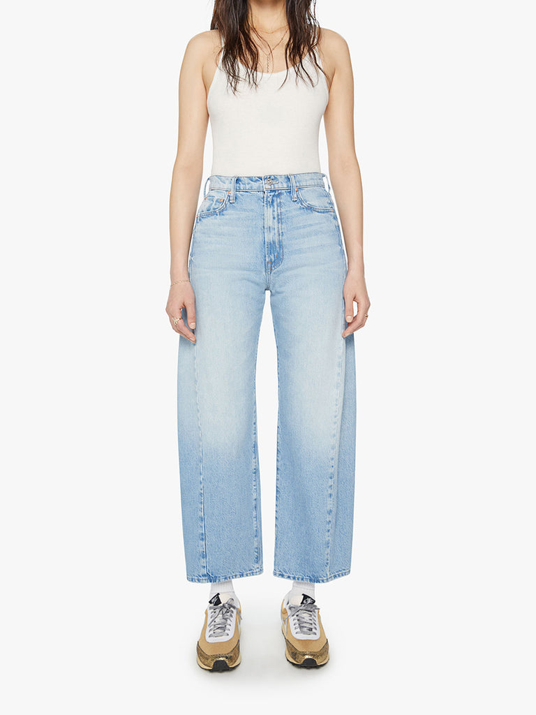 A super high-waisted jean with a wide, curved leg, an ankle-length inseam and a clean hem. Cut from 100% SUPERIOR denim, This Is How I Roll is a light blue wash with whiskering and fading at the knee.