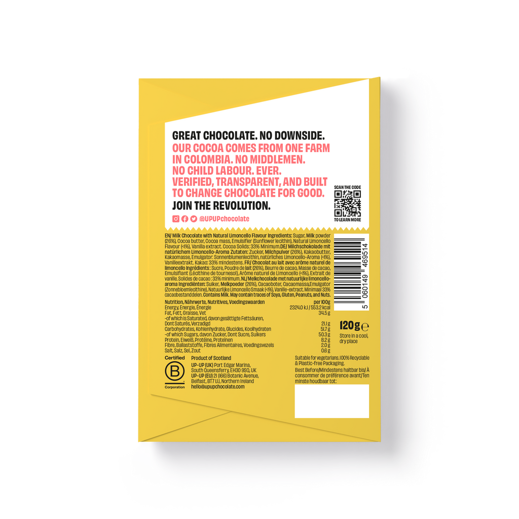 UP-UP Limoncello Chocolate is inspired by Italy’s beloved liqueur. Crafted with Single Estate 35% cacao from fine flavour cocoa beans grown at the renowned "El Rosario" farm in Colombia’s Necoclí region, this bar is infused with the vibrant zest of limoncello flavour. The result is a delightful blend of creamy sweetness and refreshing citrus notes, offering a perfectly balanced and taste of sunshine in every bite. Ingredients: Sugar, milk powder (26%), cocoa butter, cocoa mass, emulsifier: sunflower lecithin, Natural Limoncello Flavour (<1%), vanilla extract. Allergens: Contains Milk. May contain: soya, gluten, peanuts and nuts.