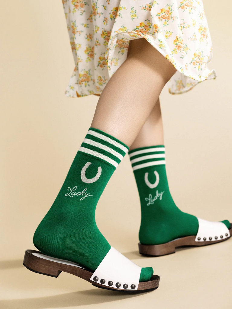 Feel the luck on your feet! These Kelly green socks feature sporty stripes at the cuff and a lucky horseshoe charm to bring you good vibes all day long.