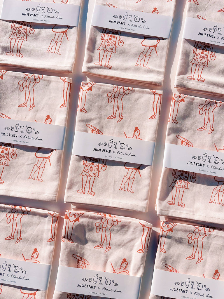 A collaboration between Phthalo Ruth & Julie Peach - This tea towel features her "Dinner Girls" pattern on a blush color 100% cotton.