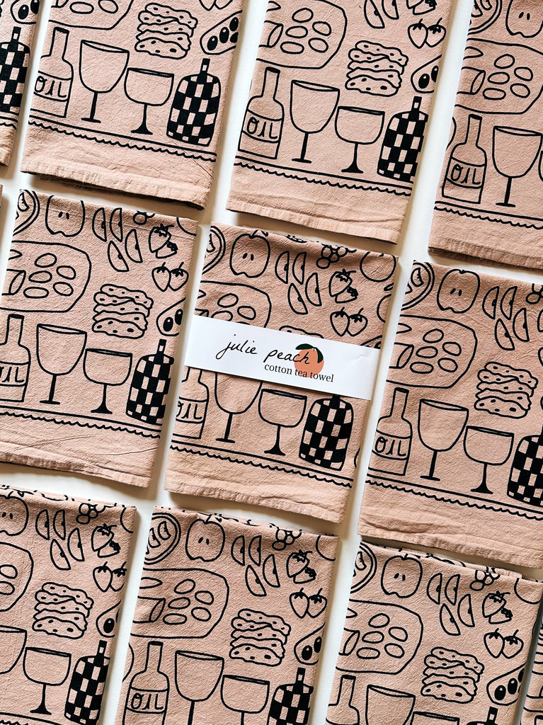 Julie Peach original design & illustration 100% cotton 20" Square Machine washable Packaged with belly band, including care instructions Designed in Denver. Silkscreened in India with my production partner that is a Fair Trade International member, certified with the Global Recycled Standard.