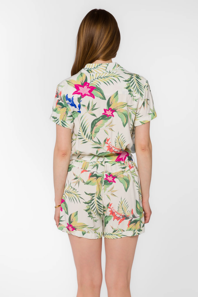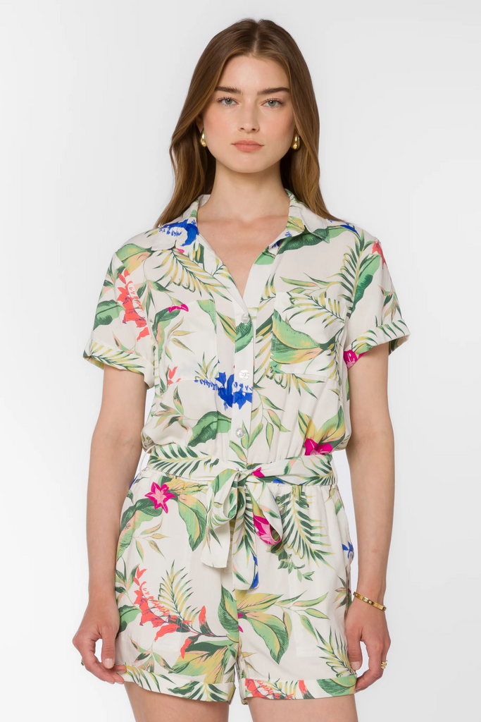 Unleash your wild side with the playful Rosalie Tropical Jungle Romper. This short sleeve romper features a split neck and button up design, along with convenient chest patch pockets and side pockets. Plus, the self belt adds a touch of style and functionality. Adventure awaits!