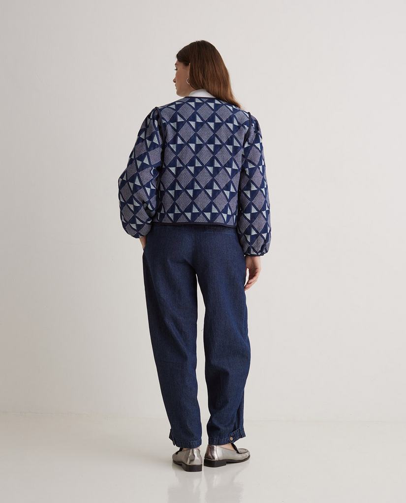 Cotton and viscose blend jacket. Jacquard. Round neckline. Long puffed sleeves. Faux-tortoiseshell buttons. Lined. Contrast piping. Piping on armhole. Two front patch pockets.