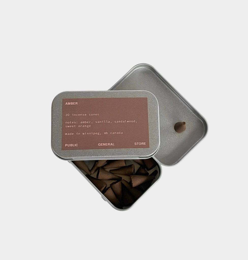 Each tin includes 2O incense cones, soaked in our hand-blended signature fragrances. Our cones are made from pressed ground bamboo and joss tree powder with a burn time of 30 minutes - the scent lingers in the air for much longer. Scent notes: amber, vanilla, sandalwood, sweet orange How to burn: Light the tip of the cone with a match or lighter for 10-15 seconds until it glows, and then gently blow out the flame. Place it on a heat-proof burner - the cone will smolder and release smoke on its own.