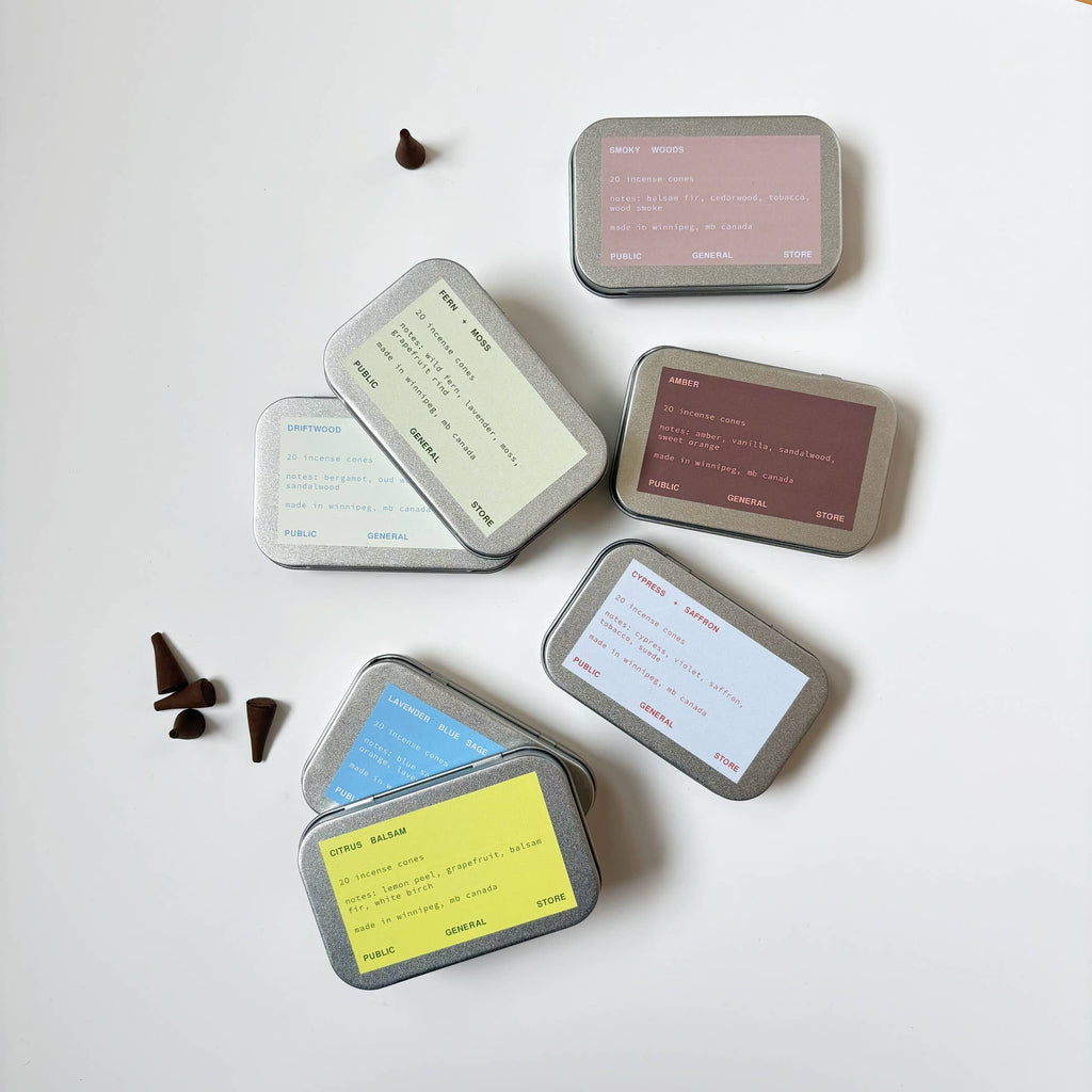 Each tin includes 2O incense cones, soaked in our hand-blended signature fragrances. Our cones are made from pressed ground bamboo and joss tree powder with a burn time of 30 minutes - the scent lingers in the air for much longer. Scent notes: lemon peel, grapefruit, balsam fir, white birch How to burn: Light the tip of the cone with a match or lighter for 10-15 seconds until it glows, and then gently blow out the flame. Place it on a heat-proof burner - the cone will smolder and release smoke on its own.