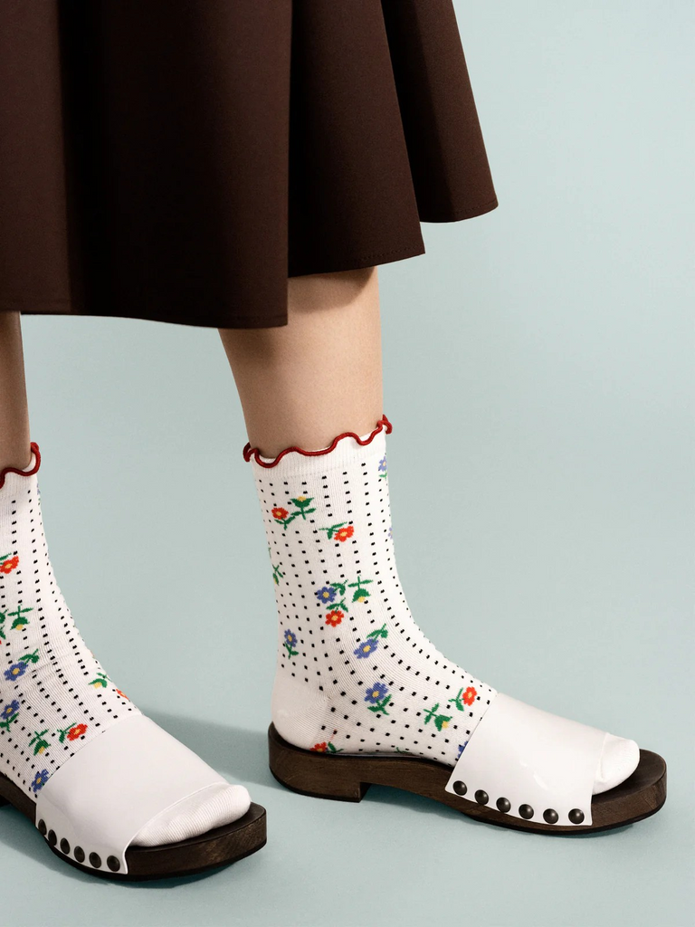 Get ready to be in full bloom with the Dottie Floral Crew. This stylish top features sweet cotton florals that pop against the dotted body. With a unique contrast stitched lettuce cuff, you'll be serving looks all day long!
