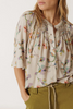 Viscose shirt with floral motif print. Bell effect sleeve with handmade smock details on the yoke and buttoned front closure.