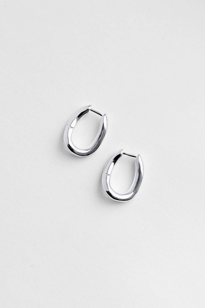 Elongated hinged hoops with a slight twist. Materials: Sterling Silver or Gold Plated Brass (1 micron) Dimensions: 2mm wide