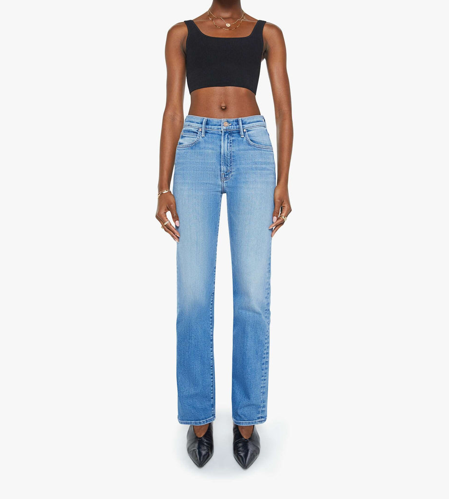 An expanded collection of foundational pieces designed for All Day, Every Day. Created for versatility, layering, and year-round wearability, these are the pieces you will never stop reaching for. A high-rise straight leg jean with a 32-inch inseam and a clean hem. Cut from stretch denim, Fan Favorite is a mid-blue with whiskering and fading at the knee.