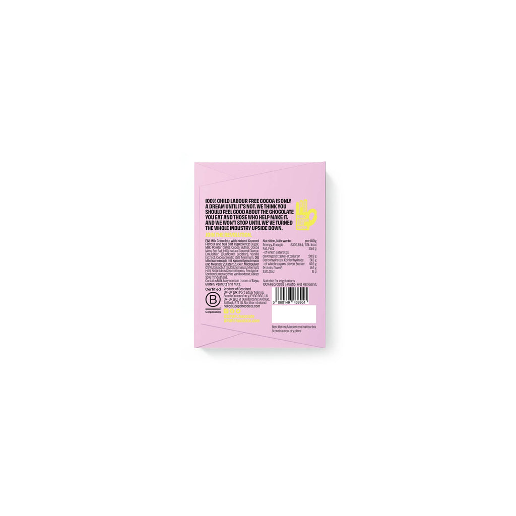 Sweet. Salty. Sell-out. UP-UP Salted Caramel 60g is a flavour-packed tillside star made with Single Estate Colombian cocoa and a golden touch of sea salt. Designed for high turnover and ethical credibility, this bar is palm oil free, vegetarian, and a proven trade favourite. Bold branding grabs attention, standout flavour keeps tills ringing.